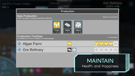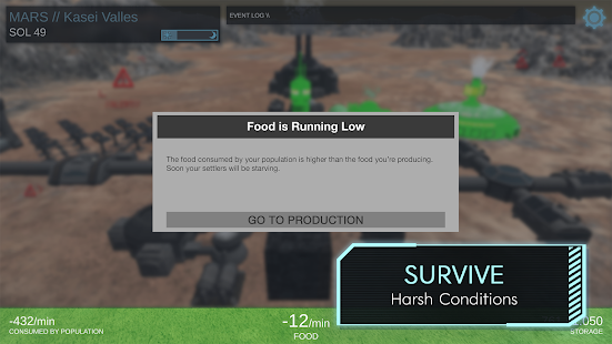 À medida que sua cidade cresce, você precisa equilibrar a produção de recursos com as necessidades da comunidade em crescimento. Você precisará planejar com antecedência e descobrir como prover seus colonos com suprimentos tão corriqueiros na Terra. Monitore de perto os recursos da sua cidade, como oxigênio, água e comida, para garantir que seus cidadãos estejam saudáveis e que sua cidade possa continuar a prosperar.